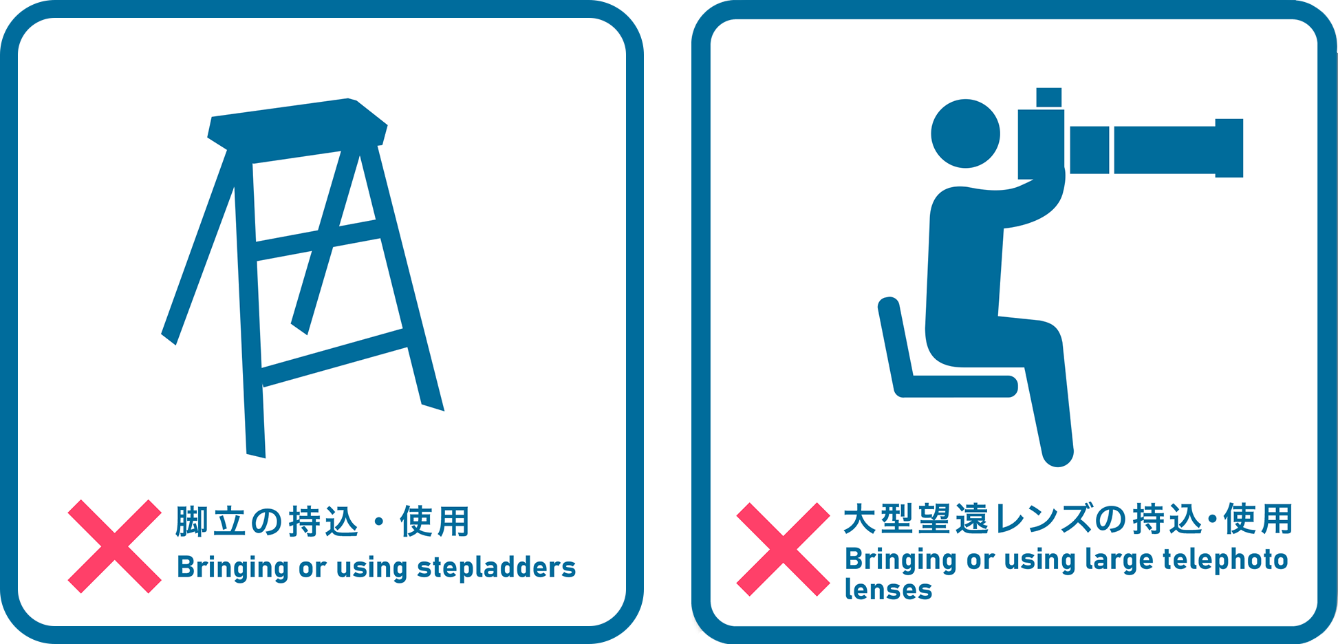 - Use of photography assistance equipment such as selfie sticks and selfie sticks in the spectator seats