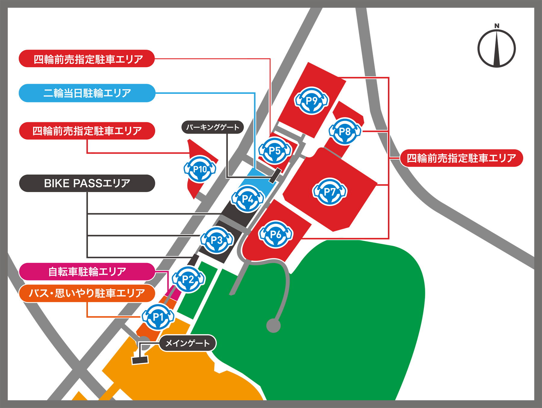 Parking area for bicycles: P2 (Front Parking Lot), Pool Gate, 1 Corner Gate, Degner East Gate, West Straight Gate, West Paddock GateOperating days: July 3 (Fri) to 5 (Sun)