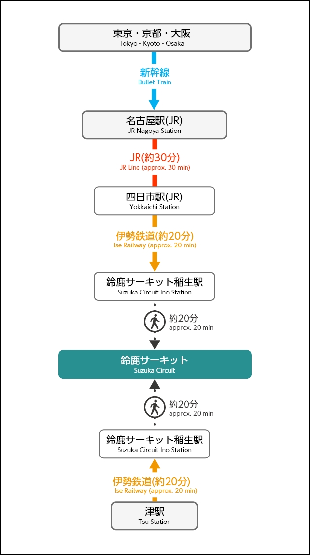 Ise Railway "Suzuka Circuit Ino Station" has limited train frequency and platform facilities, resulting in significant restrictions on the number of passengers per train set. Especially from the end of the final race through the evening, it becomes extremely crowded, and you may have to wait more than three hours to board, or depending on the situation, you might not be able to board on the same day. Therefore, we strongly recommend refraining from using Suzuka Circuit Ino Station and instead using Kintetsu "Shiroko Station" (about an 80-minute walk from the 1st Corner Gate) or Kintetsu "Hiratacho Station" (about a 60-minute walk from the Main Gate).