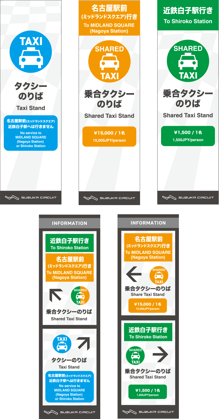 | Fare | ・From Kintetsu Shiroko Station West Exit to Suzuka Circuit Main Gate ・From SUZUKA CIRCUIT Taxi Boarding Area (P9) to Kintetsu Shiroko Station West Exit →1,500yen (per person, elementary school age and above) Payment by cash only ・From SUZUKA CIRCUIT Taxi Boarding Area (P9) to Nagoya Station Front (Midland Square) →15,000yen (per person, elementary school age and above) Payment by cash only |