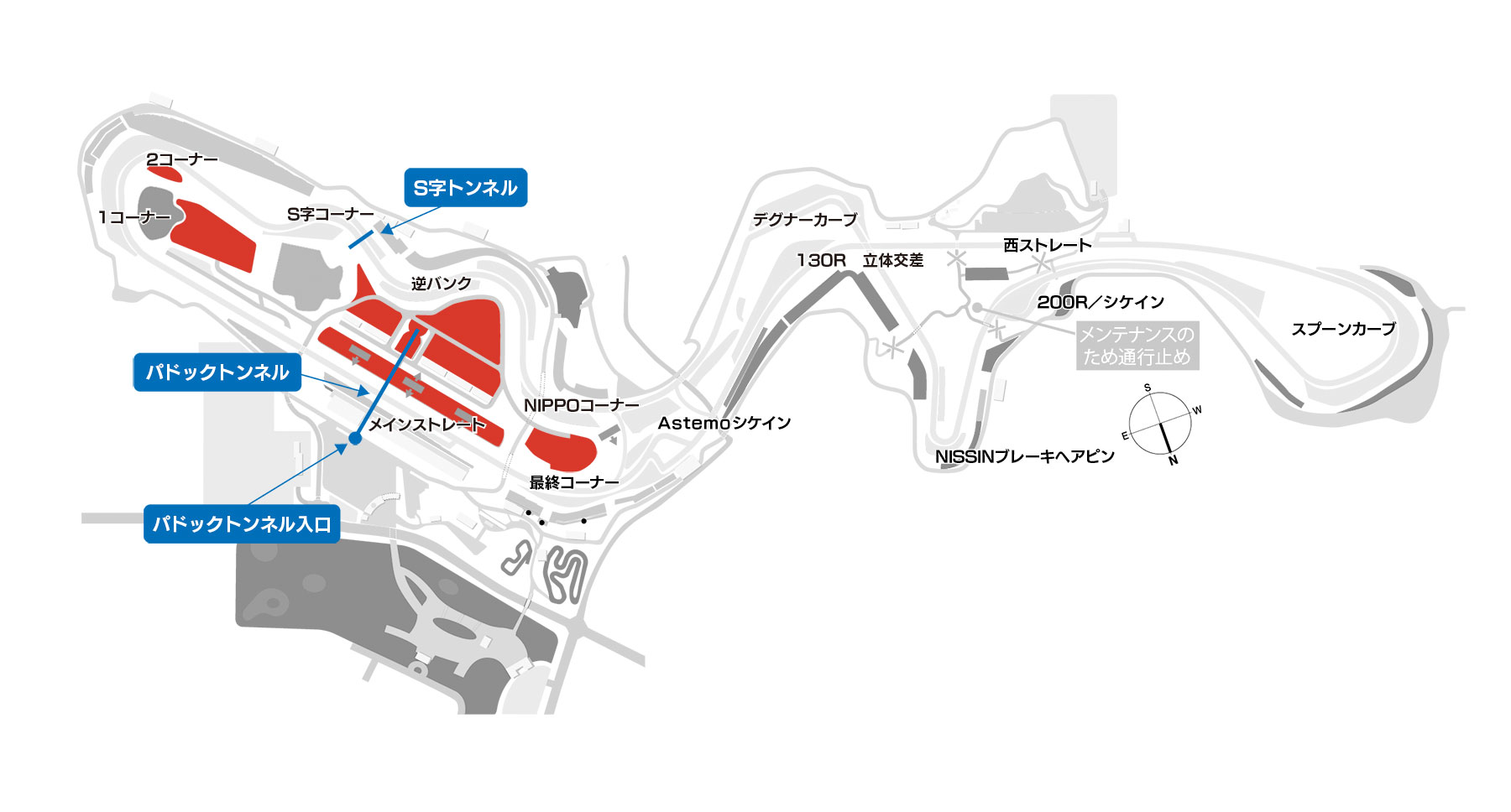 ・Paddock (Gekikan Area, S-Curve Tunnel)* Admission to the paddock is not allowed on Wednesday, October 22.On Friday, October 24, only those with passes allowing paddock admission may enter. Please note that admission tickets alone do not grant access.