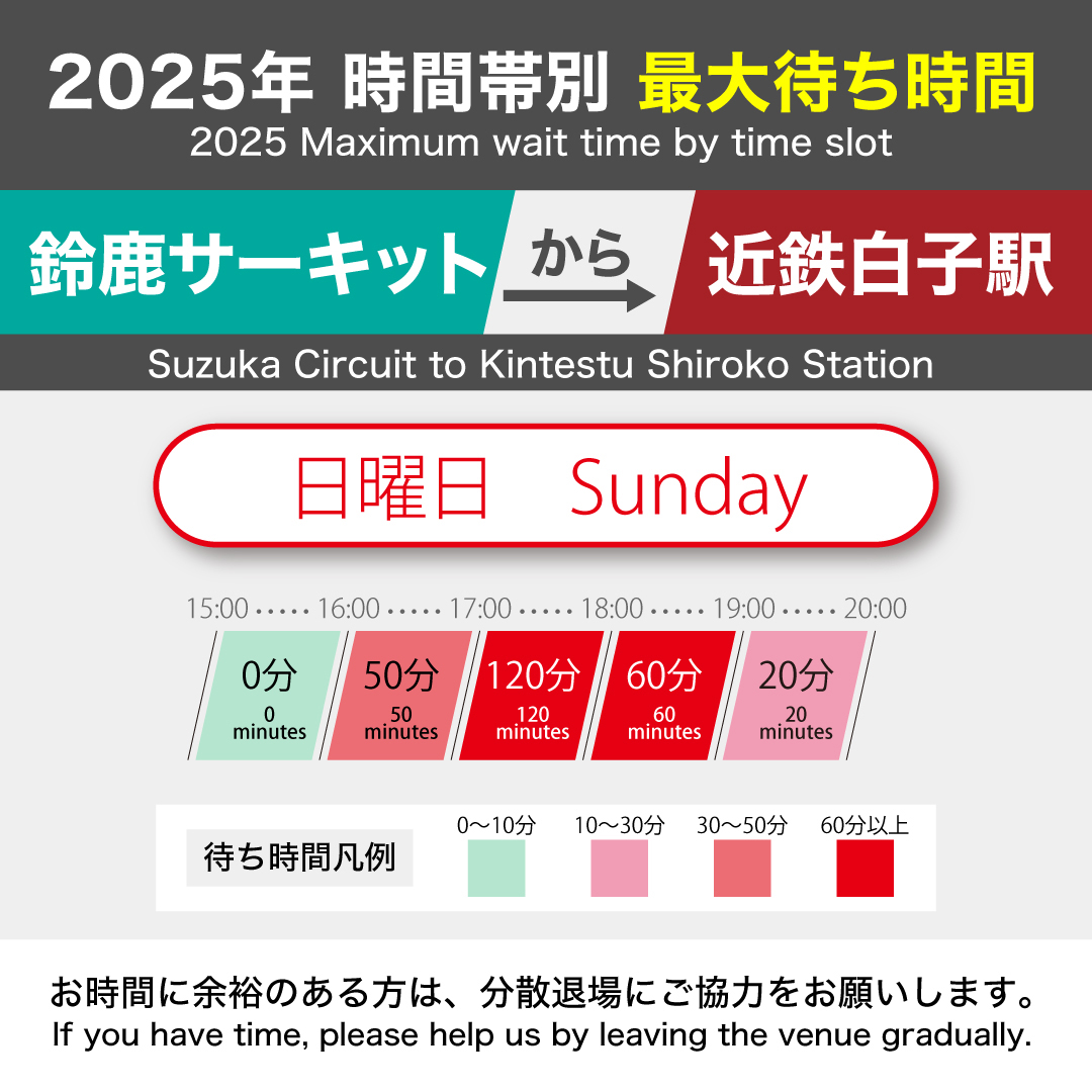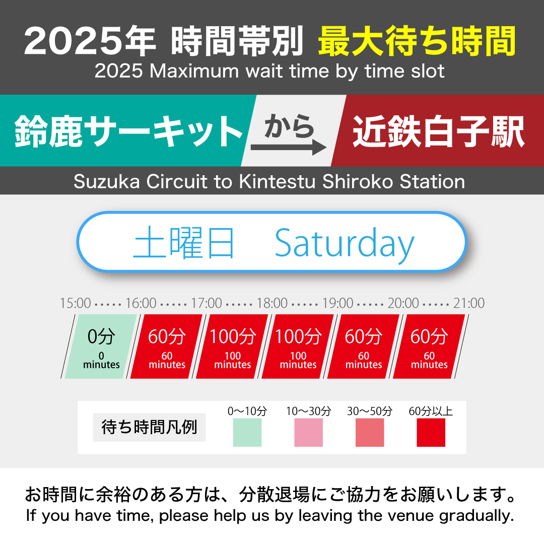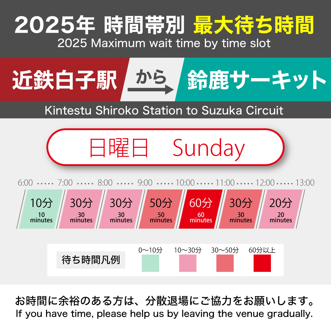 F1日本グランプリ開催期間中、近鉄白子駅から臨時シャトルバスを運行。事前のご予約は不要です。 ※混雑時には、乗車までに時間が掛かる場合がございます(2023年実績:最長2時間、2024年実績:最長1時間)