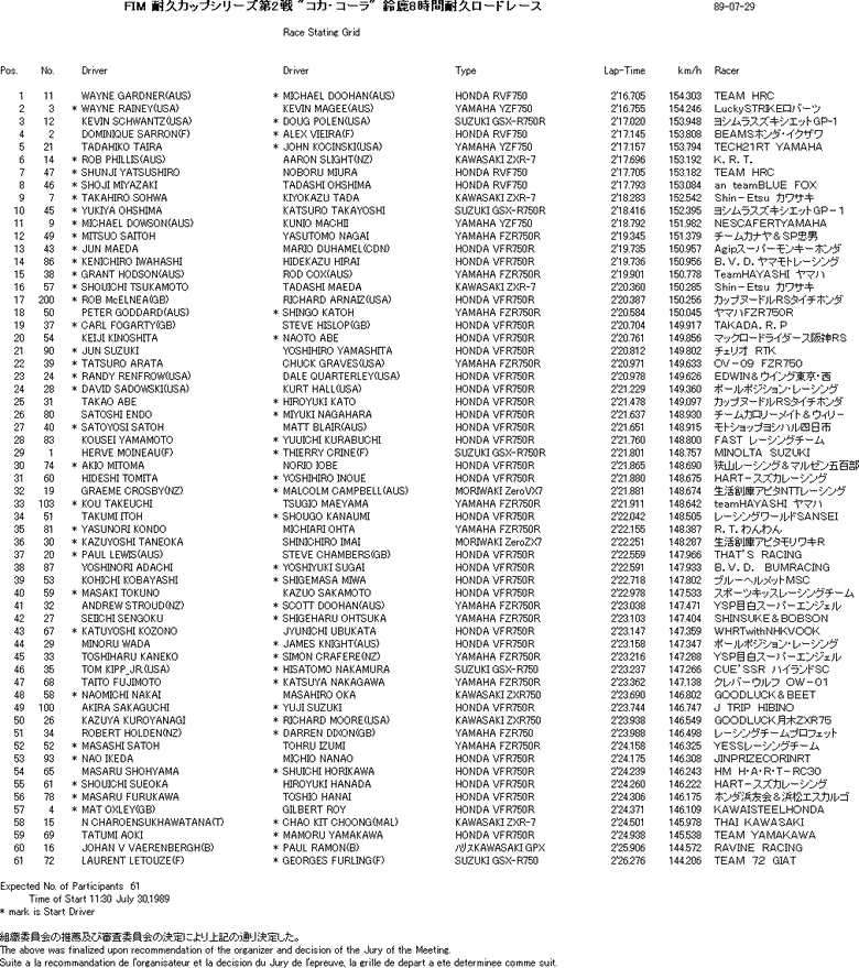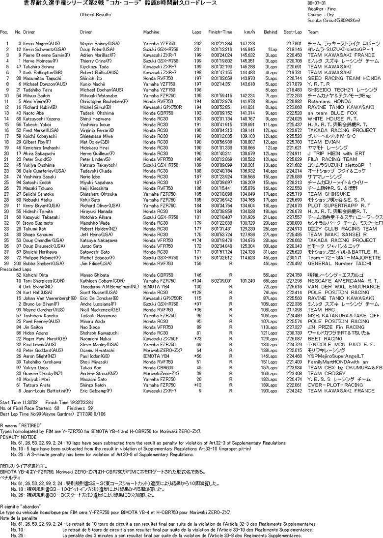 ボールドウィンとともに8耐史上最多の3勝をマークし、8耐の中心ライダーとなっていたガードナーが、レース前に8耐引退を表明。ドゥーハンのケガにより、急遽、ガードナーのパートナーがビーティーとなり、予選は5番手だった。しかし、レースではガードナー、ビーティーともに絶好調で、周回を重ねる毎に後続を引き離していく。そしてレース終盤、ガードナー/ビーティーはガス欠を心配して予定外のピットインをするが、この間に伊藤/辻本に詰め寄られてしまう。だが、伊藤はチェッカーまで残り約25分となったヘアピンカーブで痛恨の転倒。これで、ガードナーは8耐引退レースを、最多の4勝をマークするという形で飾った。