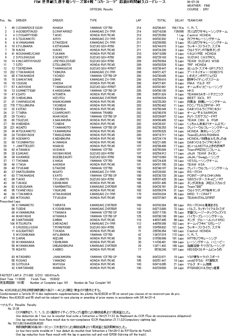レースはセオリー通りの戦いを演じた伊藤/宇川が、淡々と8時間を走り切って、フルタイムを戦った8耐で、初めての日本人ペアによる優勝となった。2位には、唯一、伊藤/宇川と同一ラップのコシンスキー/バロスが入ったが、コシンスキーを襲ったレース序盤でのトラブルが、最後まで響いた形となった。