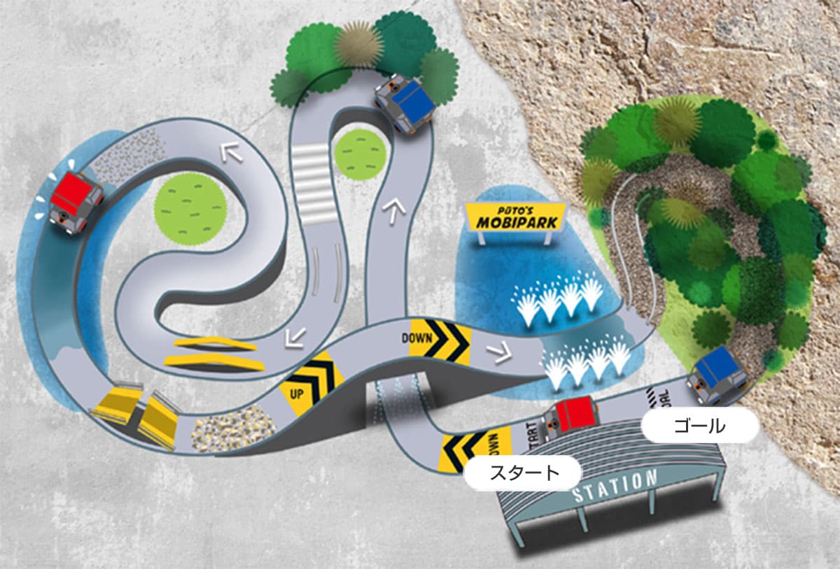 勇気を出して、25%の急勾配“激坂テスト”を下りきり、“ウォーターテスト”で一気に水の中につき進めばポイントが加算されるぞ。達成できたら“ウォーターキャノン”の祝砲が待っている。