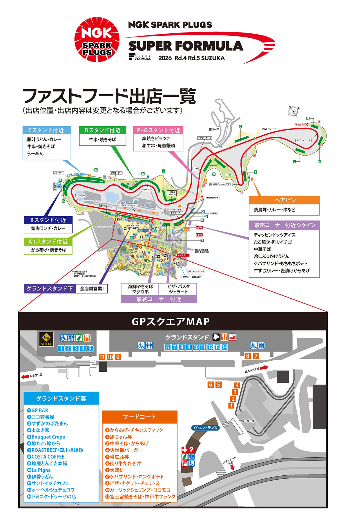 大会開催期間中は、パークやGPスクエア内に加え、コースサイドでも様々なグルメが楽しめます。パーク内レストランについて、詳しくはこちら