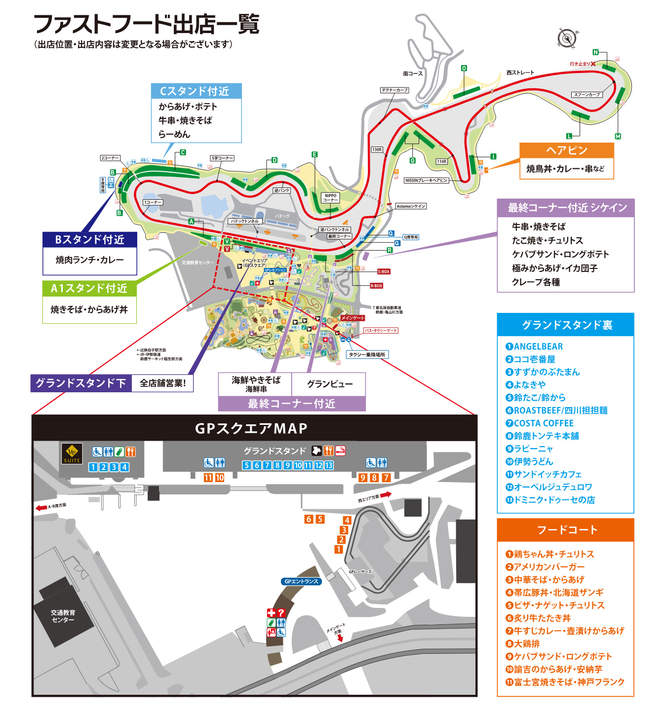 JAFグランプリ開催期間中は、パークやGPスクエア内に加え、コースサイドでも様々なグルメが楽しめます。パーク内レストランについて、詳しくはこちら