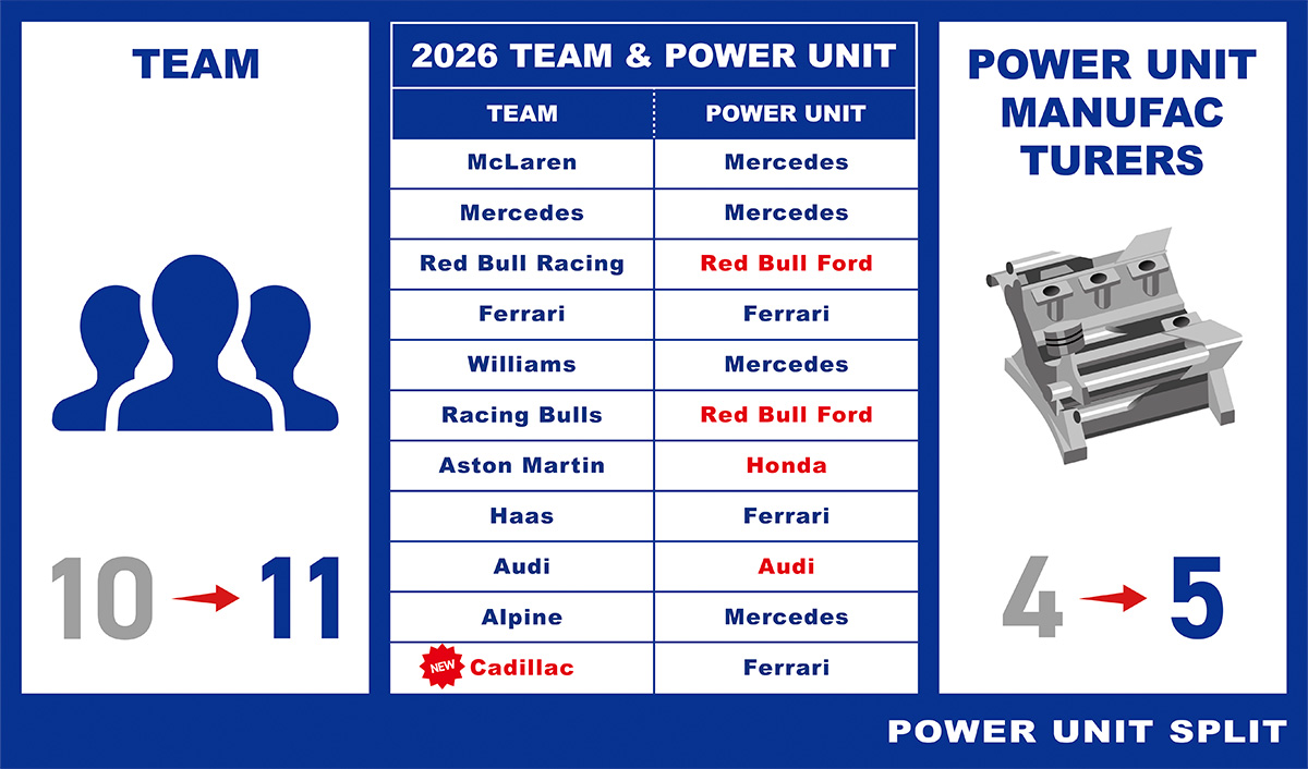 讓我們來確認面向2026年的參賽車隊與車手變動。Kick Sauber因德國汽車製造商Audi收購車隊,體制轉移為Audi F1車隊。並且作為全新車隊,美國GM(通用汽車)的高級品牌Cadillac以車隊名稱成立新車隊「Cadillac F1車隊」開始參賽,車隊數量增加至11隊,賽車數量增至22輛。