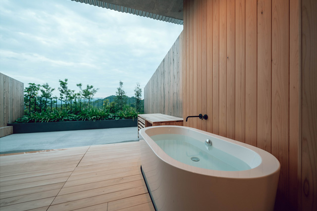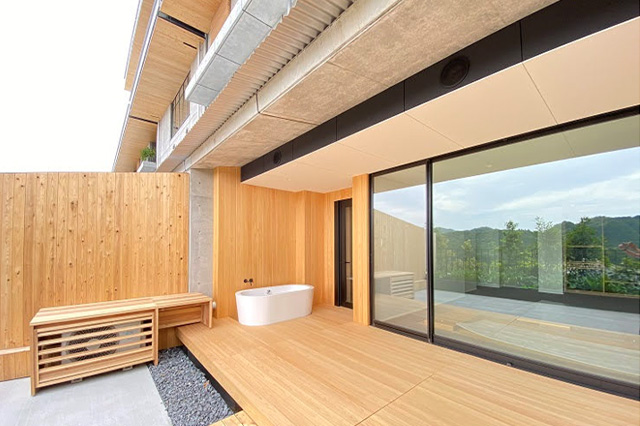 設有與客房同等大小露台並配備露天風呂的客房。採用戶外浴缸、室內淋浴間、廁所及洗手台三點獨立設計,並以白色為基調的簡約現代風格。您可在日本特有的露天風呂中盡情放鬆身心。