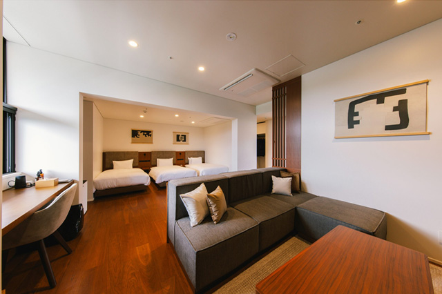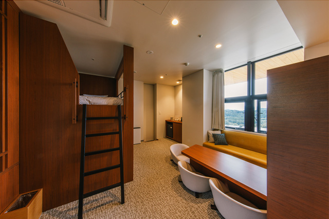 飯店首次引進雙層床,並設置可脫鞋休憩的小高台。營造一進入房間時的期待感。此客房位於飯店最高樓層,擁有可一覽多氣大自然景觀的大型露台,並配備露天風呂,客房面積達72m²,設有高音質喇叭及足部按摩機。