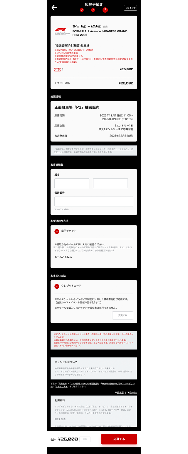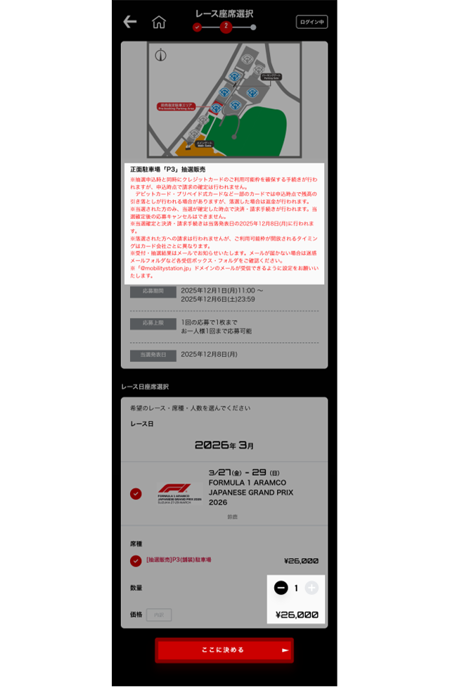 正面停車場「P3」原本作為以下觀賽席票券(Formula 1 Paddock Club™・VIP觀賽套房・R-BOX・GRAN VIEW・S-BOX)同時購買限定商品販售,但因預計無法完售,部分停車位將改為非同時購買限定商品的一般抽選販售方式。