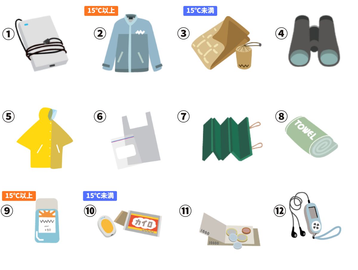 - 天氣仍然微涼時,建議內搭使用吸濕發熱素材等的衣物。外套也建議選擇較厚重的款式。若白天意外變熱,只要脫掉一件即可。頸部也很重要,請準備圍巾、披肩或頸套。